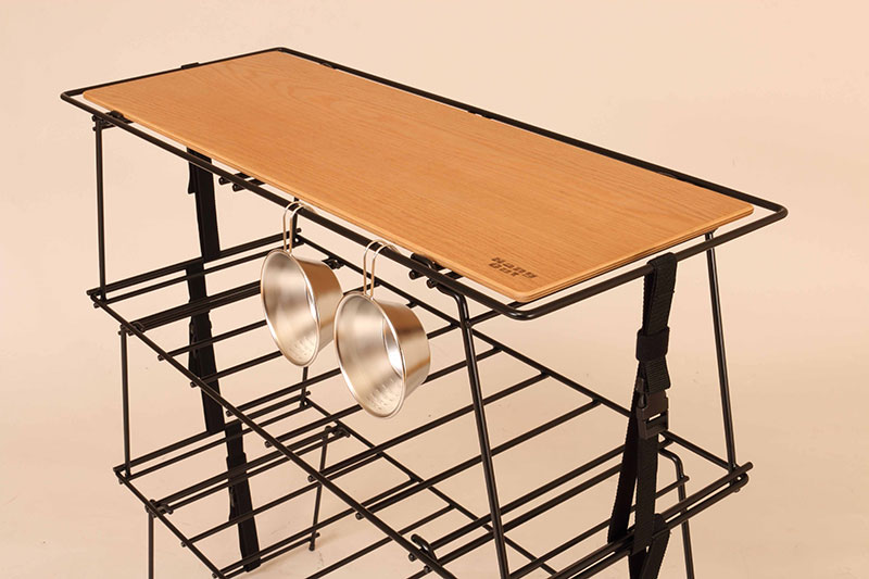 スタッキングラックは収納量に合わせて増設してキャンプギアを使いやすく収納したり重ねて使うことで、カウンターテーブルのように使えるマルチアイテム。