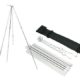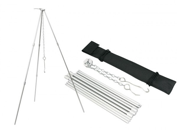 焚火缶等の吊るす事ができる鍋に最適なトライポッドです。キャンプはもちろんの事ツーリング、沢登り等にも軽量の為最適です。9本のアルミ製の棒を、ネジ込んで組立てるだけで簡単に使用する事が可能。別の用途としてはガスランタン等のランタンハンガーとしての使用もできます。吊り下げ用のステンレスチェーンは上部のストッパーを利用する事で、火と鍋の距離を調整がする事ができます。