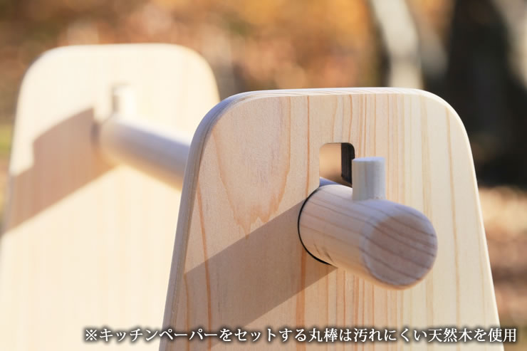 キッチンペーパーをセットする棒はガタツキが無いようにしっかりと止まる設計にしています。車での移動中など、カタカタと音がしないように仕上げています。