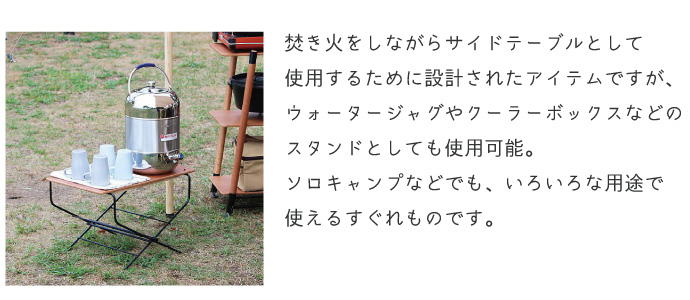 焚き火をしながらサイドテーブルとして使用するために設計されたアイテムですが、そのサイズからウォータージャグやクーラーボックスなどのスタンドとしても使用可能。