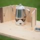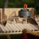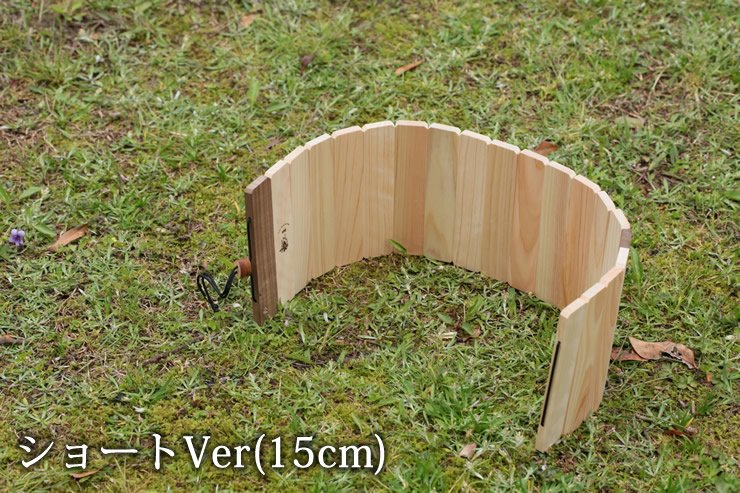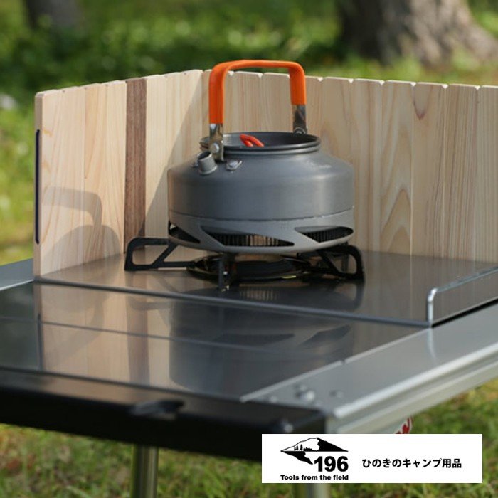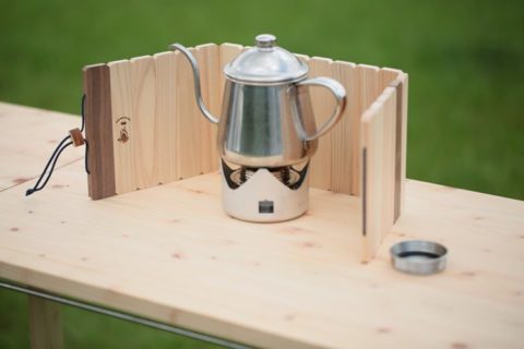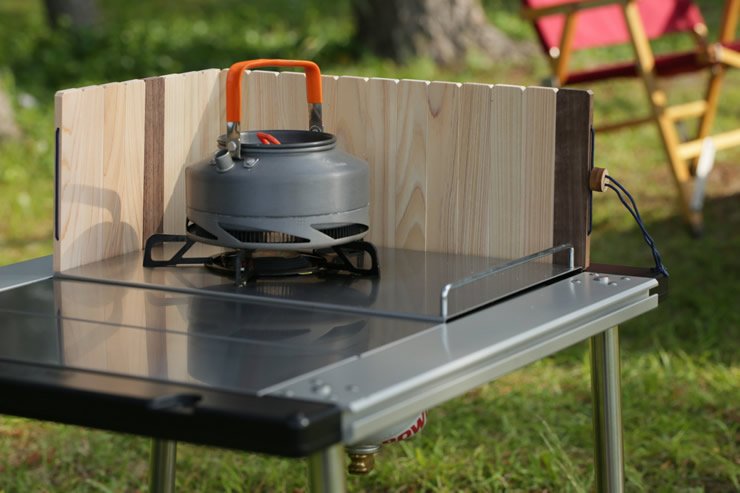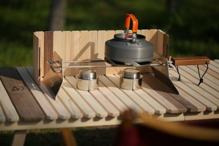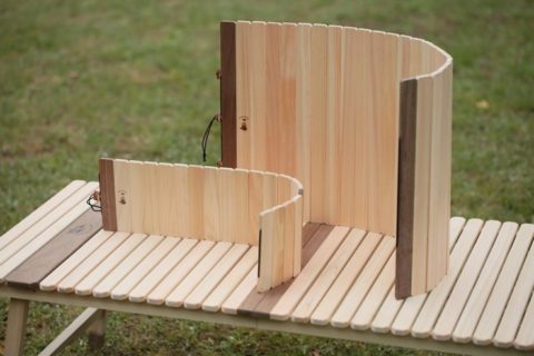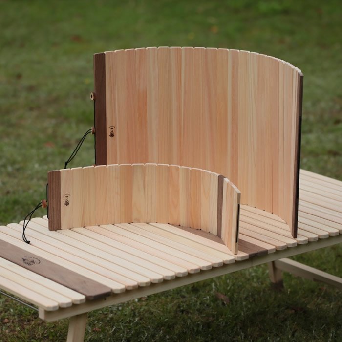 バーナー・ストーブに対応した、ひのきとウォールナットの折りたたみ風防(ウィンドスクリーン)です