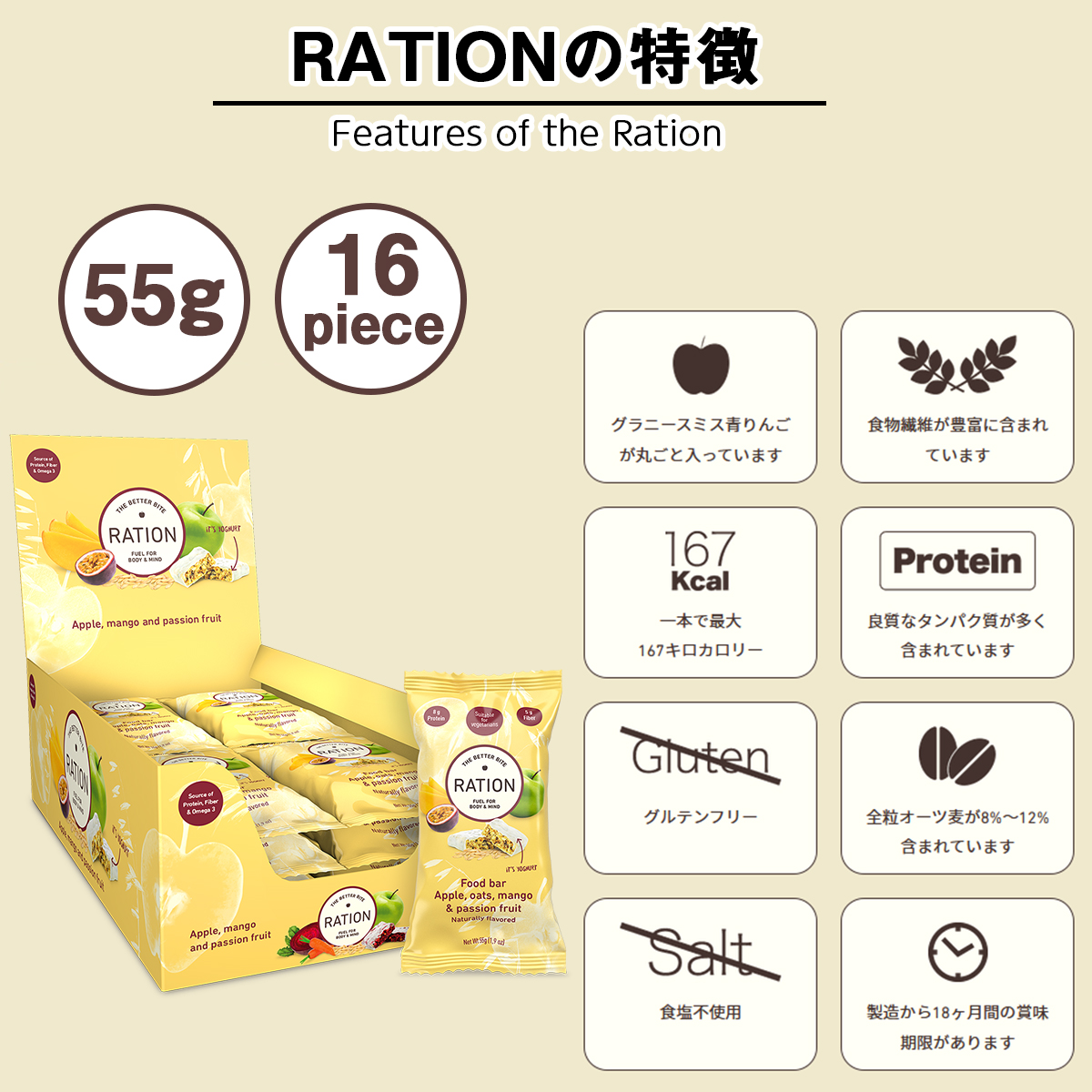 RATIONはそんなニーズに応えることができる製品となっており、シリアルバー先進国である、欧米や北米でも多くの支持を得ております。