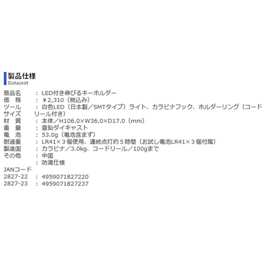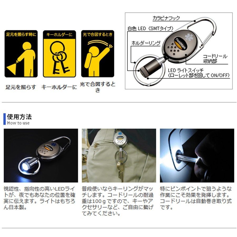 【ツール】白色LED(日本製/SMTタイプ)ライト、カラビナフック、ホルダーリング(コードリール付き)