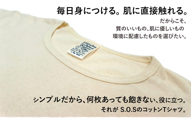 毎日身につけるものだからこそ、身体に、地球にストレスの無いものを選びたい。拘り抜かれたSOSのカットソーは、オーガニック独特の風合いと他にはない着心地の良さを生みます。