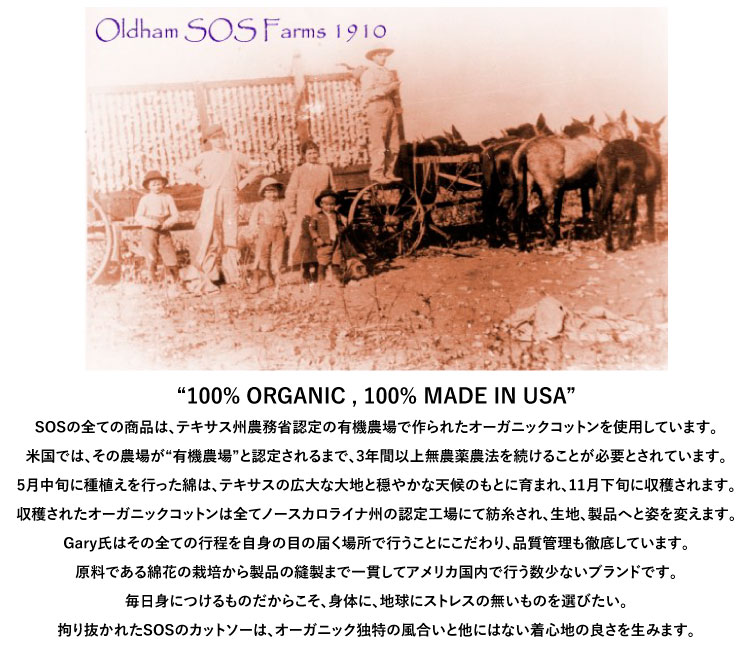 “100% ORGANIC , 100% MADE IN USA”に強い拘りを持つ人物で、SOSの全ての商品はテキサス州農務省認定の有機農場で作られたオーガニックコットンを使用しています。米国では、その農場が“有機農場”と認定されるまで、3年間以上無農薬農法を続けることが必要とされています。