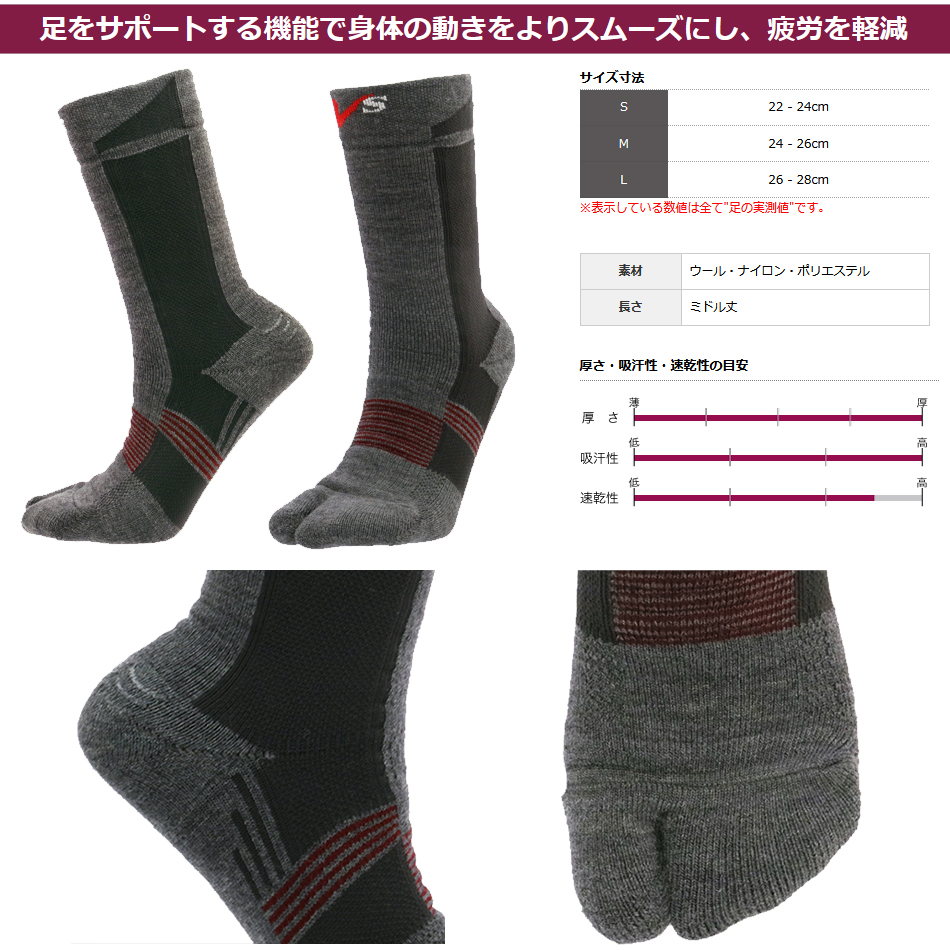 V-System タビ型ソックス V2-MW202 メリノウール・タビ型 厚手・ミドル丈