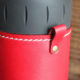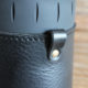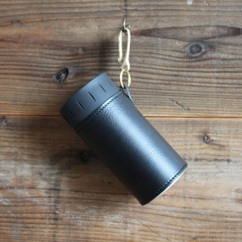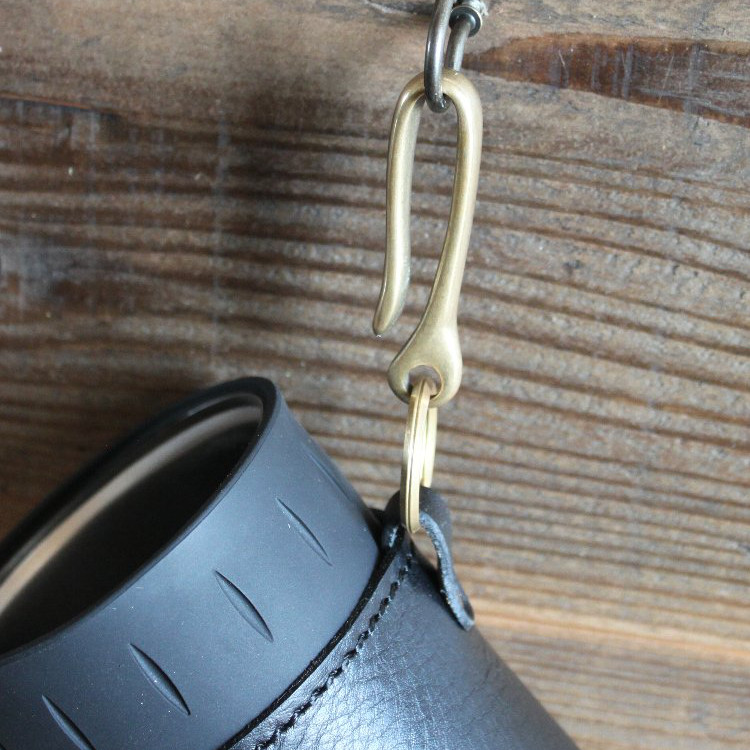 革タブをあしらい、使わない時は別売りの真鍮無垢ホルダーなどでザックやベルトループに引っ掛けられるようにしました。