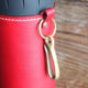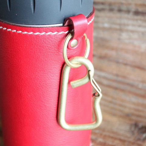 革タブをあしらい、使わない時は別売りの真鍮無垢ホルダーなどでザックやベルトループに引っ掛けられるようにしました。