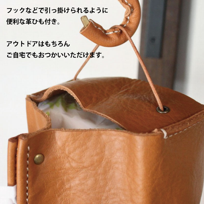 フックなどで引っ掛けられるように便利な革ひも付き。