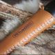アンティックゴールドカラーのハトメをあしらい共革紐を付けています。シースに引っ掛けて外れ防止だけでなく、これがあることによりフックなどにも掛けられるようになります。