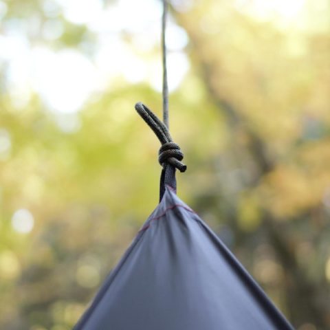 さらにその先のトグルフリクション用のループは、正方形タープ使用頻度の高いプロフェッショナル向けの工夫で、小枝一本でリッジラインにフリクションノットを施工できるようになっています。