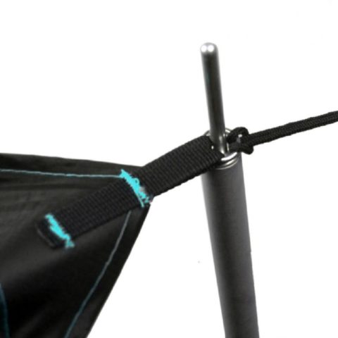さらにその先のトグルフリクション用のループは、タープ使用頻度の高いプロフェッショナル向けの工夫で、小枝一本でリッジラインにフリクションノットを施工できるようになっています。