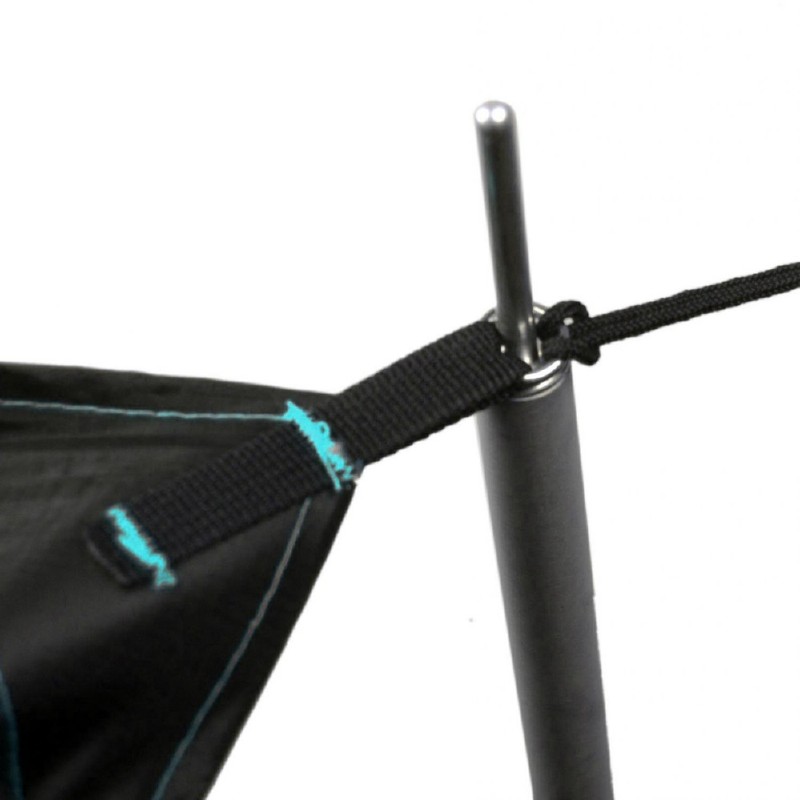 その金属リングは、一般的なタープポールの先端を差し込むことができ、開けたキャンプ場でのファミリーキャンプでも設営しやすくなっております。
