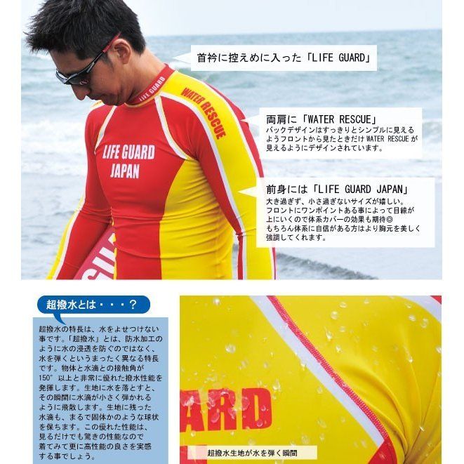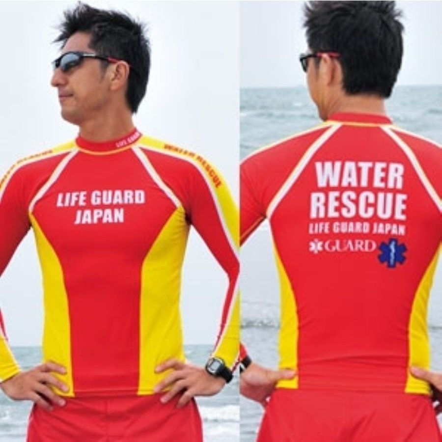配色の切替によって、身体を流線型&シャープに見せてくれるGUARDオリジナルのラッシュガードです。フロントはよりシャープに見えるよう、バックは大きく見えすぎないよう緩やかな流線になっているので、男性でも女性でも問わずボディラインを綺麗に見せてくれます。バックデザインにはライフセーバーの方や、救急、救命の方にも嬉しいスターオブライフが入っています。ポイントにホワイトが配色されている事によって、くど過ぎないカラーリングが実現!ライフセーバー用のサーフパンツとの相性も◎です。生地は撥水生地を使用しており、コーティング加工とは異なる為生地の風合いのまま速乾性に優れ、入水しても水を弾いてくれるのでガード活動にはもちろん、練習用、フィットネス時に最適です。シンプルで飽きのこないデザインなので重宝します。