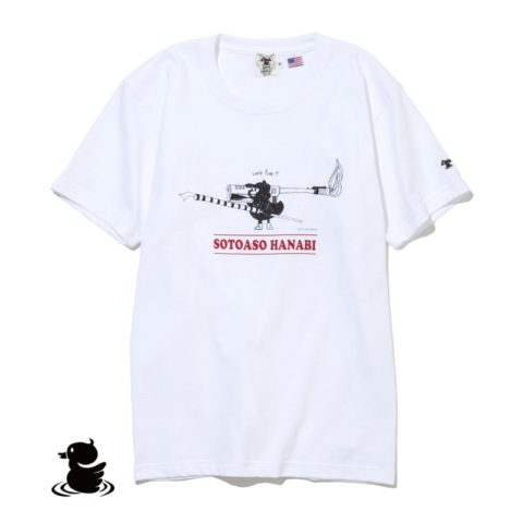 ■grnoutdoorとSOTOとのコラボアイテムであるガストーチを片手に花火を楽しもうとしているダックロー。 日が暮れても全力でソトアソビを楽しむダックローをイメージしたオリジナルTシャツです。