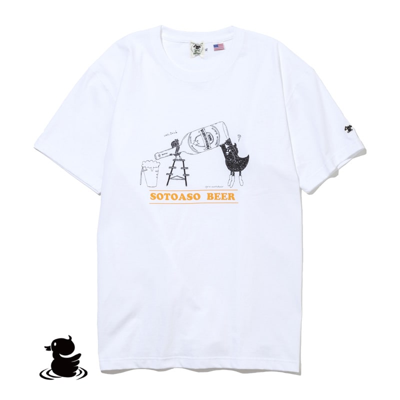 「ソトアソビにはお酒は欠かすことのできない存在だ」と豪語するダックロー。 酒豪の彼は空のグラスが許せない。空いたグラスを見つけたらすぐに注ぎにやってくるちょっとめんどくさい奴。 キンキンのビールを注いでますが若干身長が足りず苦戦している姿をイメージしたオリジナルTシャツです。
