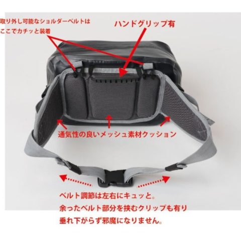 ・多様に使えるグリップハンドル付、さらにショルダーベルトも付属なので肩掛けバッグとしても使える3WAYウエストバッグ