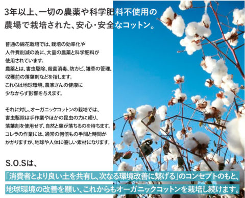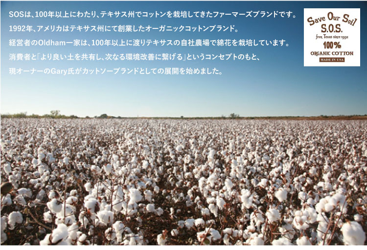毎日身につけるものだからこそ、身体に、地球にストレスの無いものを選びたい。拘り抜かれたSOSのカットソーは、オーガニック独特の風合いと他にはない着心地の良さを生みます。